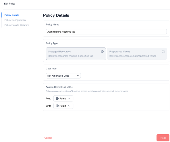 After adding policy details, you can configure policy criteria and filters for **Untagged Resources** or **Unapproved Values** and then click **Next.**