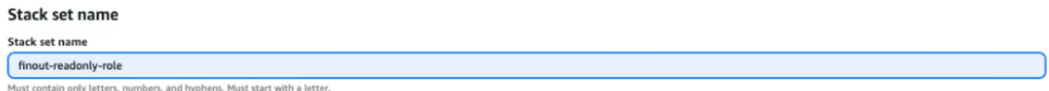 1. **Stack set name** - Specify a name for the CloudFormation stack (e.g. finout-readonly-role).<br>