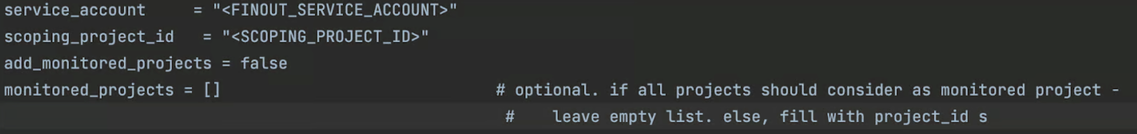 * <**SCOPING\_PROJECT\_ID**> - Add a new ID for the scoping project to be created. Default new project id: finout-scoping-project-xxxxxx.
